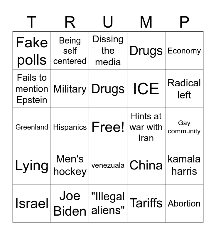 This bingo card has a free space and 24 words: Men's hockey, Joe Biden, Drugs, Israel, Economy, Fake polls, Fails to mention Epstein, Being self centered, Hints at war with Iran, venezuala, ICE, Greenland, China, kamala harris, Military, Tariffs, Gay community, Dissing the media, Radical left, Hispanics, Abortion, Lying, Drugs and "Illegal aliens".
