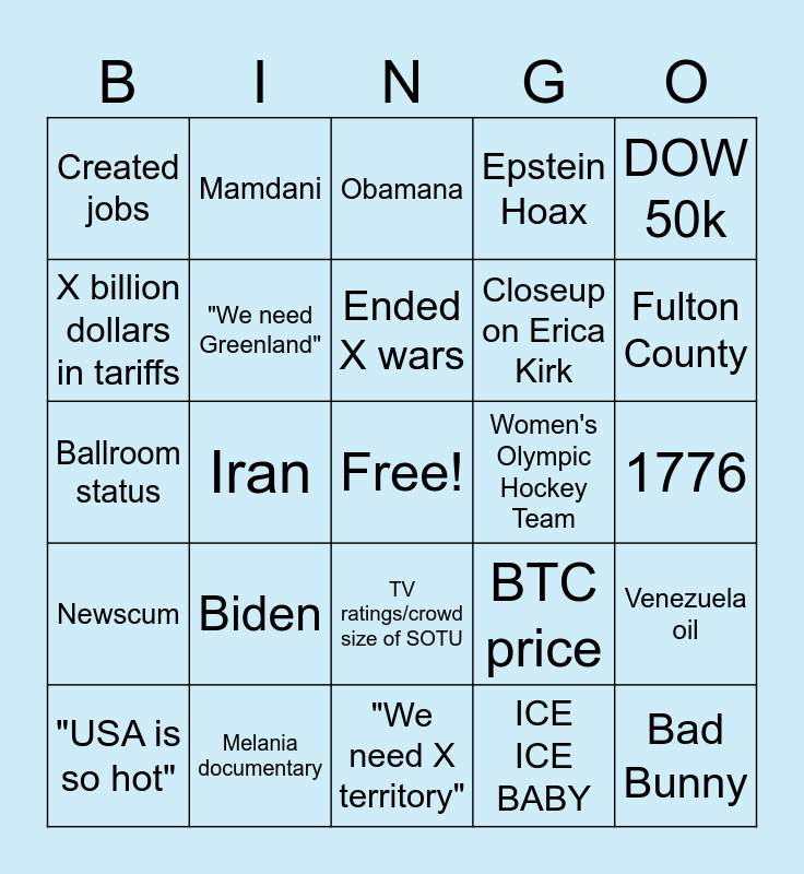 This bingo card has a free space and 24 words: Biden, Melania documentary, Ended X wars, "USA is so hot", DOW 50k, Created jobs, X billion dollars in tariffs, Mamdani, Women's Olympic Hockey Team, TV ratings/crowd size of SOTU, Closeup on Erica Kirk, Ballroom status, BTC price, Venezuela oil, "We need Greenland", ICE ICE BABY, 1776, Obamana, Fulton County, Iran, Bad Bunny, Newscum, Epstein Hoax and "We need X territory".