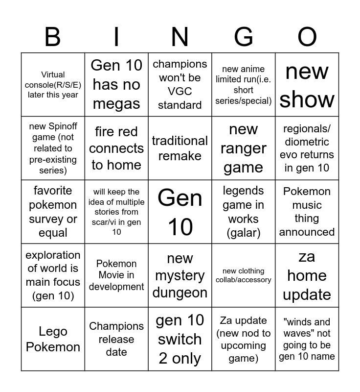This bingo card has a free space and 24 words: Pokemon Movie in development, Champions release date, traditional remake, Lego Pokemon, new show, Virtual console(R/S/E) later this year, new Spinoff game (not related to pre-existing series), Gen 10 has no megas, legends game in works (galar), new mystery dungeon, new ranger game, favorite pokemon survey or equal, new clothing collab/accessory, za home update, fire red connects to home, Za update (new nod to upcoming game), Pokemon music thing announced, champions won't be VGC standard, regionals/ diometric evo returns in gen 10, will keep the idea of multiple stories from scar/vi in gen 10, "winds and waves" not going to be gen 10 name, exploration of world is main focus (gen 10), new anime limited run(i.e. short series/special) and gen 10 switch 2 only.