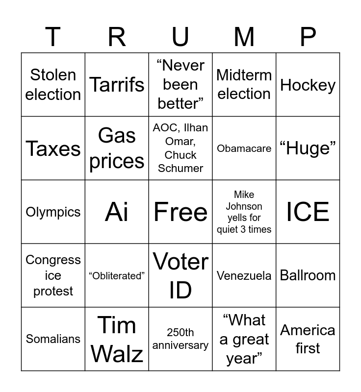 This bingo card has a free space and 24 words: “Obliterated”, Tim Walz, AOC, Ilhan Omar, Chuck Schumer, Somalians, Hockey, Stolen election, Taxes, Tarrifs, Mike Johnson yells for quiet 3 times, Voter ID, Obamacare, Olympics, Venezuela, Ballroom, Gas prices, “What a great year”, ICE, “Never been better”, “Huge”, Ai, America first, Congress ice protest, Midterm election and 250th anniversary.