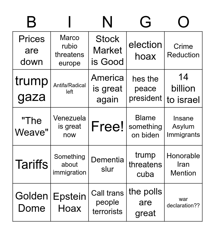 This bingo card has a free space and 24 words: Something about immigration, Epstein Hoax, America is great again, Golden Dome, Crime Reduction, Prices are down, trump gaza, Marco rubio threatens europe, Blame something on biden, Dementia slur, hes the peace president, "The Weave", trump threatens cuba, Honorable Iran Mention, Antifa/Radical left, the polls are great, Insane Asylum Immigrants, Stock Market is Good, 14 billion to israel, Venezuela is great now, war declaration??, Tariffs, election hoax and Call trans people terrorists.