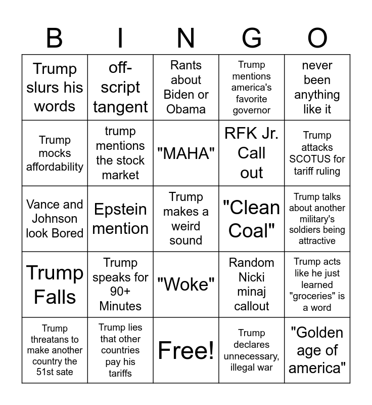 This bingo card has 25 words: Trump Falls, Trump lies that other countries pay his tariffs, Trump makes a weird sound, Trump declares unnecessary, illegal war, never been anything like it, Trump slurs his words, off-script tangent, Rants about Biden or Obama, "Clean Coal", Trump acts like he just learned "groceries" is a word, Trump mocks affordability, trump mentions the stock market, Free!, Random Nicki minaj callout, Trump attacks SCOTUS for tariff ruling, Trump threatans to make another country the 51st sate, Epstein mention, "MAHA", RFK Jr. Call out, Trump talks about another military's soldiers being attractive, Vance and Johnson look Bored, Trump speaks for 90+ Minutes, "Woke", Trump mentions america's favorite governor and "Golden age of america".