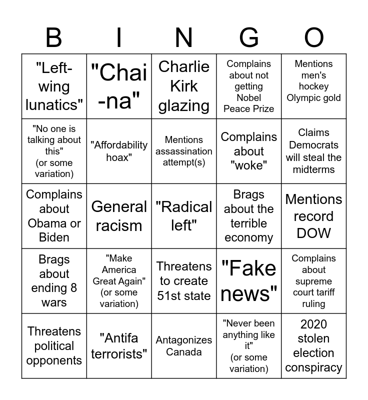 This bingo card has a free space and 24 words: "Make America Great Again" (or some variation), "Antifa terrorists", Mentions assassination attempt(s), Threatens political opponents, Mentions men's hockey Olympic gold, "Left-wing lunatics", "No one is talking about this" (or some variation), "Chai -na", Brags about the terrible economy, Threatens to create 51st state, Complains about "woke", Complains about Obama or Biden, "Fake news", Complains about supreme court tariff ruling, "Affordability hoax", "Never been anything like it" (or some variation), Mentions record DOW, Charlie Kirk glazing, Claims Democrats will steal the midterms, General racism, 2020 stolen election conspiracy, Brags about ending 8 wars, Complains about not getting Nobel Peace Prize and Antagonizes Canada.