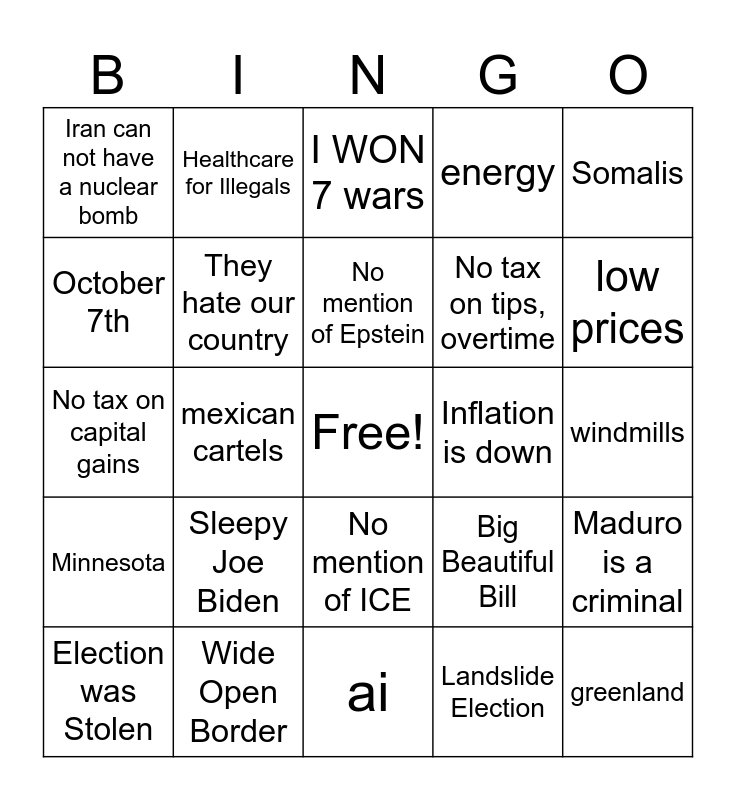 This bingo card has a free space and 24 words: Sleepy Joe Biden, Wide Open Border, No mention of Epstein, Election was Stolen, Somalis, Iran can not have a nuclear bomb, October 7th, Healthcare for Illegals, Inflation is down, No mention of ICE, No tax on tips, overtime, No tax on capital gains, Big Beautiful Bill, Maduro is a criminal, They hate our country, Landslide Election, windmills, I WON 7 wars, low prices, mexican cartels, greenland, Minnesota, energy and ai.