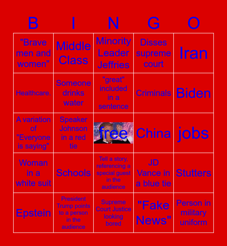 This bingo card has a free space and 30 words: President Trump points to a person in the audience, "Make America Great Again", Speaker Johnson in a red tie, Venezuela, "Brave men and women", Minority Leader Jeffries, Someone drinks water, Tell a story, referencing a special guest in the audience, China, Supreme Court Justice looking bored, jobs, Person in military uniform, "Fake News", Minnesota, Biden, Trump hand gesture (flat palms opposed), JD Vance in a blue tie, Woman in a white suit, Schools, Iran, A variation of "Everyone is saying", ICE, Middle Class, Criminals, Healthcare., Disses supreme court, Stutters, Epstein, "great" included in a sentence and "They're destroying/hate our country!".