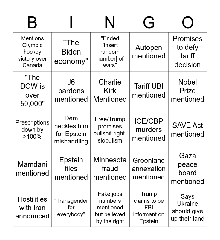 This bingo card has a free space and 24 words: Epstein files mentioned, "Transgender for everybody", Charlie Kirk Mentioned, Hostilities with Iran announced, Promises to defy tariff decision, Mentions Olympic hockey victory over Canada, "The DOW is over 50,000", "The Biden economy", ICE/CBP murders mentioned, Minnesota fraud mentioned, Tariff UBI mentioned, Prescriptions down by >100%, Greenland annexation mentioned, Gaza peace board mentioned, J6 pardons mentioned, Trump claims to be FBI informant on Epstein, SAVE Act mentioned, "Ended [insert random number] of wars", Nobel Prize mentioned, Dem heckles him for Epstein mishandling, Says Ukraine should give up their land, Mamdani mentioned, Autopen mentioned and Fake jobs numbers mentioned but believed by the right.