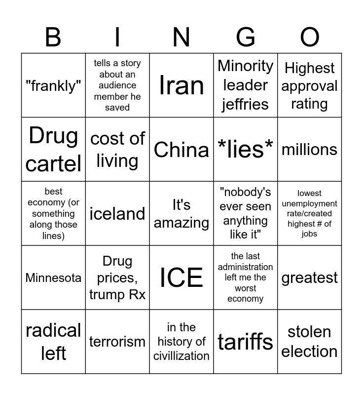 This bingo card has a free space and 29 words: radical left, greenland, iceland, venezuela, "frankly", Iran, cost of living, Drug prices, trump Rx, "nobody's ever seen anything like it", terrorism, lowest unemployment rate/created highest # of jobs, stolen election, in the history of civillization, tariffs, millions, billions, ICE, Minnesota, Highest approval rating, best economy (or something along those lines), the last administration left me the worst economy, Russia, *lies*, Drug cartel, Minority leader jeffries, tells a story about an audience member he saved, greatest, China and "i've ended so many wars".