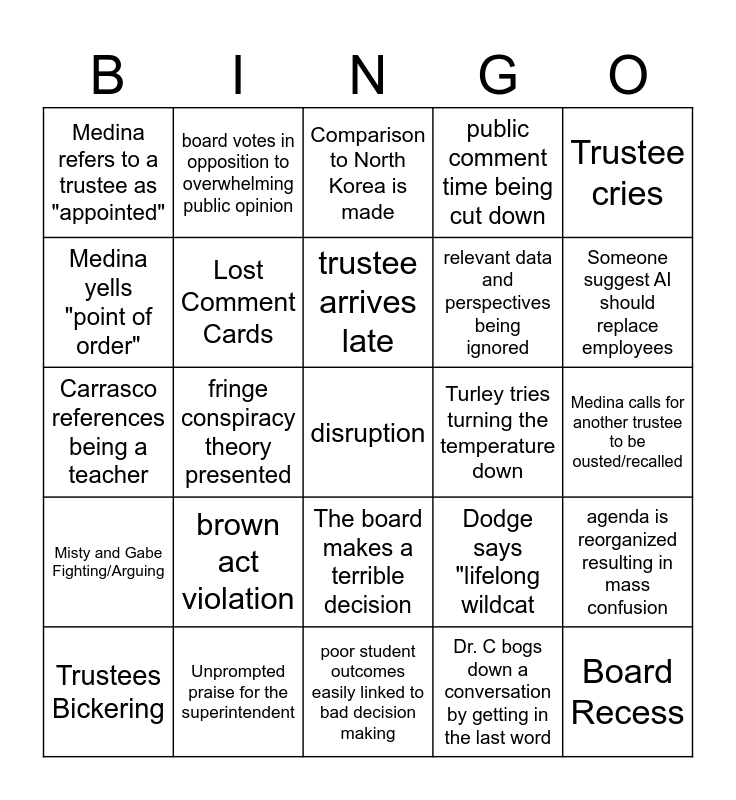 This bingo card has a free space and 29 words: Trustees Bickering, Carol Says this is off topic, when it is actually on topic., fringe conspiracy theory presented, Tech Issues, Medina refers to a trustee as "appointed", Comparison to North Korea is made, Lost Comment Cards, brown act violation, Turley tries turning the temperature down, Unprompted praise for the superintendent, Medina calls for another trustee to be ousted/recalled, Board Recess, poor student outcomes easily linked to bad decision making, Dr. C bogs down a conversation by getting in the last word, Someone suggest AI should replace employees, Community member makes bigoted comments, The board makes a terrible decision, Misty and Gabe Fighting/Arguing, Trustee cries, Carrasco references being a teacher, Dodge says "lifelong wildcat, PVFT President loses it, relevant data and perspectives being ignored, Medina yells "point of order", public comment time being cut down, board votes in opposition to overwhelming public opinion, agenda is reorganized resulting in mass confusion, trustee arrives late and trustees not following Robert's rules.