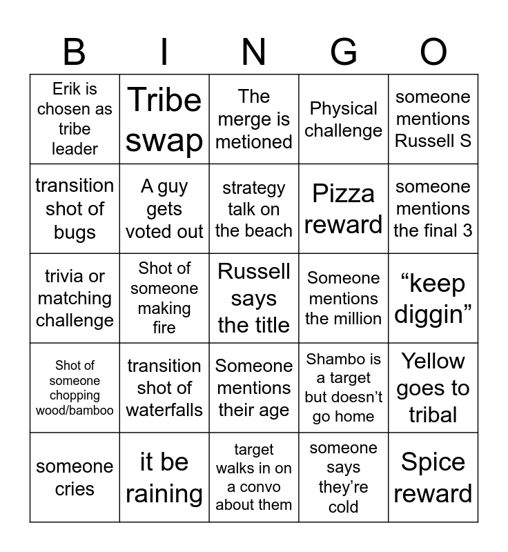 This bingo card has a free space and 24 words: transition shot of waterfalls, it be raining, strategy talk on the beach, someone cries, someone mentions Russell S, Erik is chosen as tribe leader, transition shot of bugs, Tribe swap, Someone mentions the million, Someone mentions their age, Pizza reward, trivia or matching challenge, Shambo is a target but doesn’t go home, Yellow goes to tribal, A guy gets voted out, someone says they’re cold, “keep diggin”, The merge is metioned, someone mentions the final 3, Shot of someone making fire, Spice reward, Shot of someone chopping wood/bamboo, Physical challenge and target walks in on a convo about them.