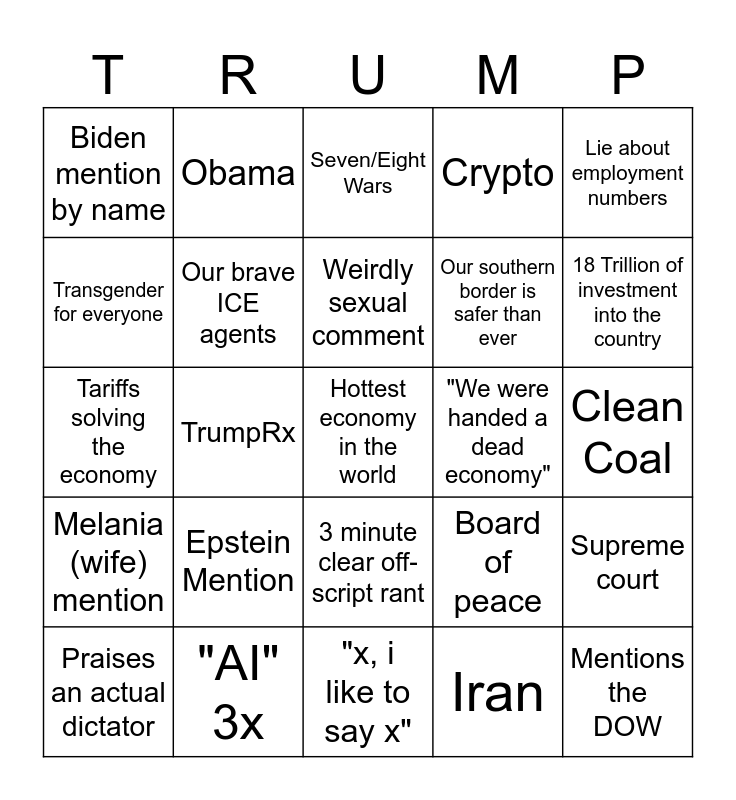 This bingo card has a free space and 24 words: Epstein Mention, "AI" 3x, Weirdly sexual comment, Praises an actual dictator, Lie about employment numbers, Biden mention by name, Transgender for everyone, Obama, "We were handed a dead economy", 3 minute clear off-script rant, Our southern border is safer than ever, Tariffs solving the economy, Board of peace, Supreme court, Our brave ICE agents, Iran, Clean Coal, Seven/Eight Wars, 18 Trillion of investment into the country, TrumpRx, Mentions the DOW, Melania (wife) mention, Crypto and "x, i like to say x".