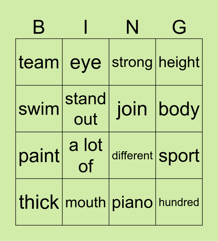 This bingo card has 16 words: mouth, sport, strong, team, paint, eye, different, piano, swim, stand out, thick, height, a lot of, body, join and hundred.