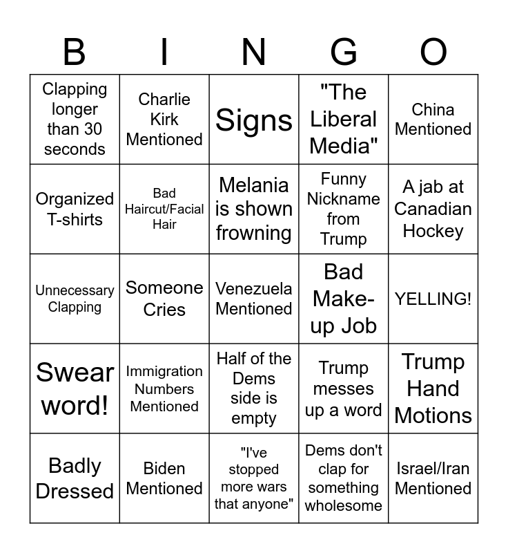 This bingo card has 28 words: Trump Hand Motions, Someone gets removed, Funny Nickname from Trump, Dems don't clap for something wholesome, Organized T-shirts, Signs, Charlie Kirk Mentioned, Swear word!, Bad Make-up Job, Badly Dressed, Unnecessary Clapping, "The Liberal Media", Biden Mentioned, "I've stopped more wars that anyone", A jab at Canadian Hockey, Minnesota Mentioned, Immigration Numbers Mentioned, Bad Haircut/Facial Hair, Melania is shown frowning, Half of the Dems side is empty, Clapping longer than 30 seconds, Israel/Iran Mentioned, Venezuela Mentioned, Someone Cries, YELLING!, Trump messes up a word, China Mentioned and The Tolerant Left.