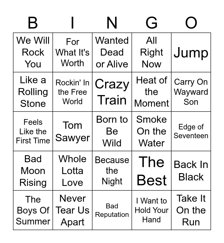 This bingo card has 28 words: Back In Black, Dream On, Heat of the Moment, I Want to Hold Your Hand, Like a Rolling Stone, Wanted Dead or Alive, For What It's Worth, Bad Moon Rising, Smoke On the Water, The Boys Of Summer, Feels Like the First Time, All Right Now, Never Tear Us Apart, Bad Reputation, Carry On Wayward Son, Smells Like Teen Spirit, Whole Lotta Love, Rockin' In the Free World, Crazy Train, Because the Night, We Will Rock You, Take It On the Run, Born to Be Wild, Tom Sawyer, Edge of Seventeen, The Best, Jump and Hold On Loosely.
