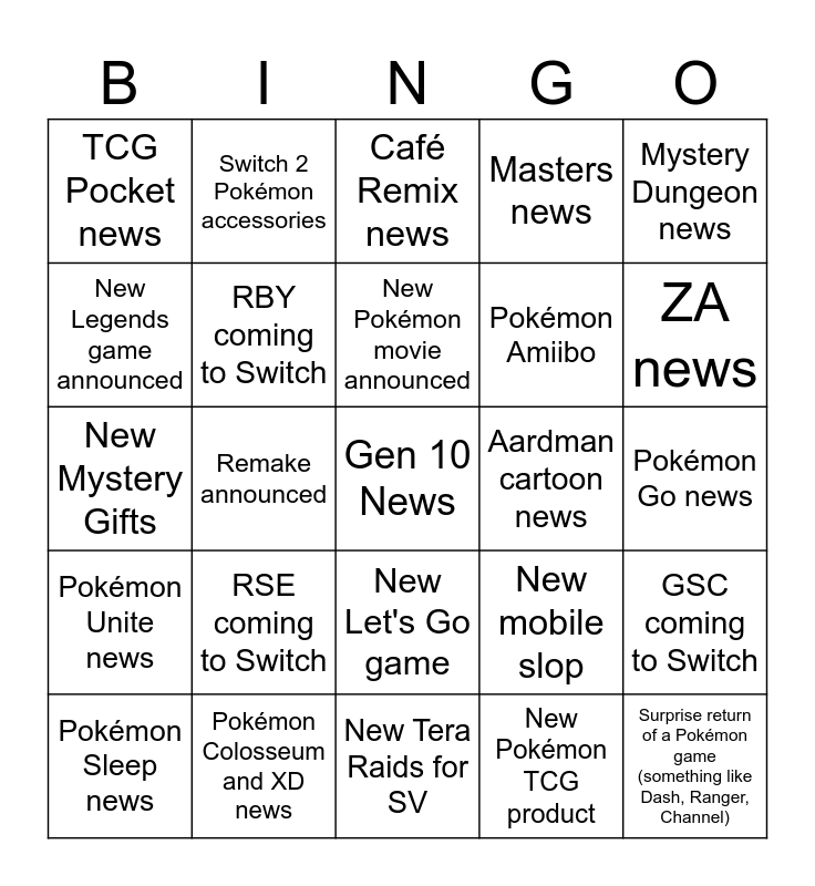 This bingo card has a free space and 24 words: RSE coming to Switch, Pokémon Colosseum and XD news, New Pokémon movie announced, Pokémon Sleep news, Mystery Dungeon news, TCG Pocket news, New Legends game announced, Switch 2 Pokémon accessories, Aardman cartoon news, New Let's Go game, Pokémon Amiibo, New Mystery Gifts, New mobile slop, GSC coming to Switch, RBY coming to Switch, New Pokémon TCG product, Pokémon Go news, Café Remix news, ZA news, Remake announced, Surprise return of a Pokémon game (something like Dash, Ranger, Channel), Pokémon Unite news, Masters news and New Tera Raids for SV.