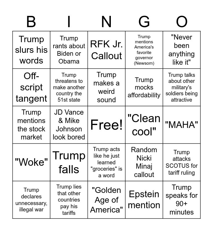 This bingo card has a free space and 24 words: Trump falls, Trump lies that other countries pay his tariffs, Trump makes a weird sound, Trump declares unnecessary, illegal war, "Never been anything like it", Trump slurs his words, Off-script tangent, Trump rants about Biden or Obama, "Clean cool", Trump acts like he just learned "groceries" is a word, Trump mocks affordability, Trump mentions the stock market, Random Nicki Minaj callout, Trump attacks SCOTUS for tariff ruling, Trump threatens to make another country the 51st state, Epstein mention, "MAHA", RFK Jr. Callout, Trump talks about other military's soldiers being attractive, JD Vance & Mike Johnson look bored, Trump speaks for 90+ minutes, "Woke", Trump mentions America's favorite governor (Newsom) and "Golden Age of America".