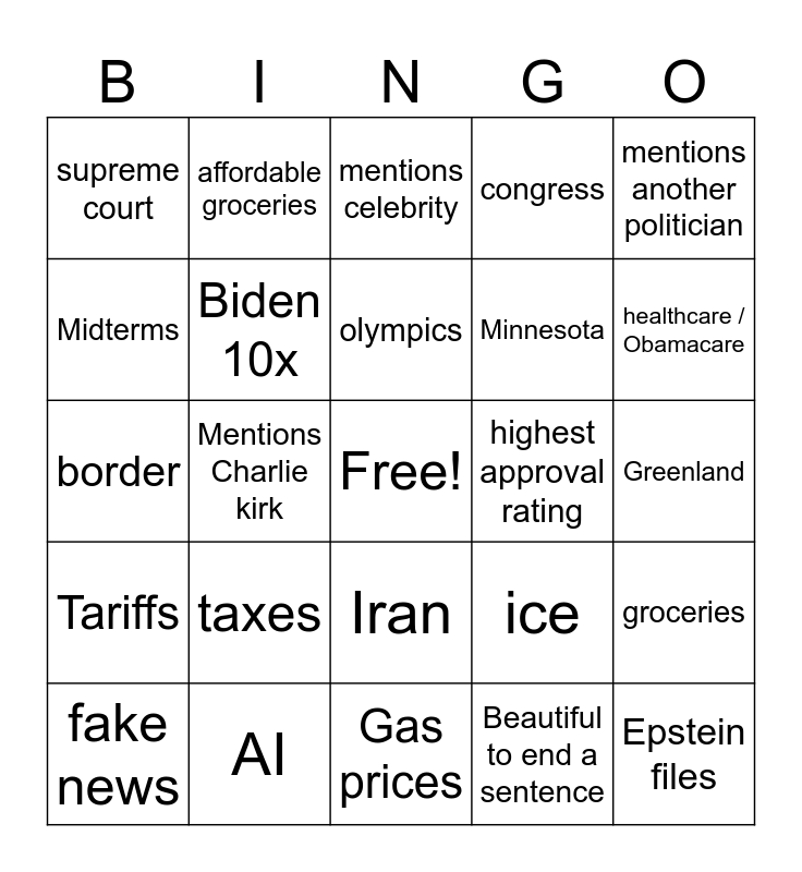 This bingo card has a free space and 24 words: taxes, AI, olympics, fake news, mentions another politician, supreme court, Midterms, affordable groceries, highest approval rating, Iran, Minnesota, border, ice, groceries, Biden 10x, Beautiful to end a sentence, Greenland, mentions celebrity, healthcare / Obamacare, Mentions Charlie kirk, Epstein files, Tariffs, congress and Gas prices.
