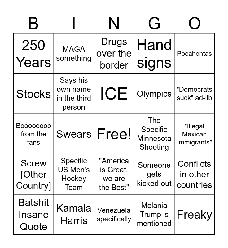 This bingo card has a free space and 24 words: Specific US Men's Hockey Team, Kamala Harris, ICE, Batshit Insane Quote, Pocahontas, 250 Years, Stocks, MAGA something, The Specific Minnesota Shooting, "America is Great, we are the Best", Olympics, Boooooooo from the fans, Someone gets kicked out, Conflicts in other countries, Says his own name in the third person, Melania Trump is mentioned, "Illegal Mexican Immigrants", Drugs over the border, "Democrats suck" ad-lib, Swears, Freaky, Screw [Other Country], Hand signs and Venezuela specifically.