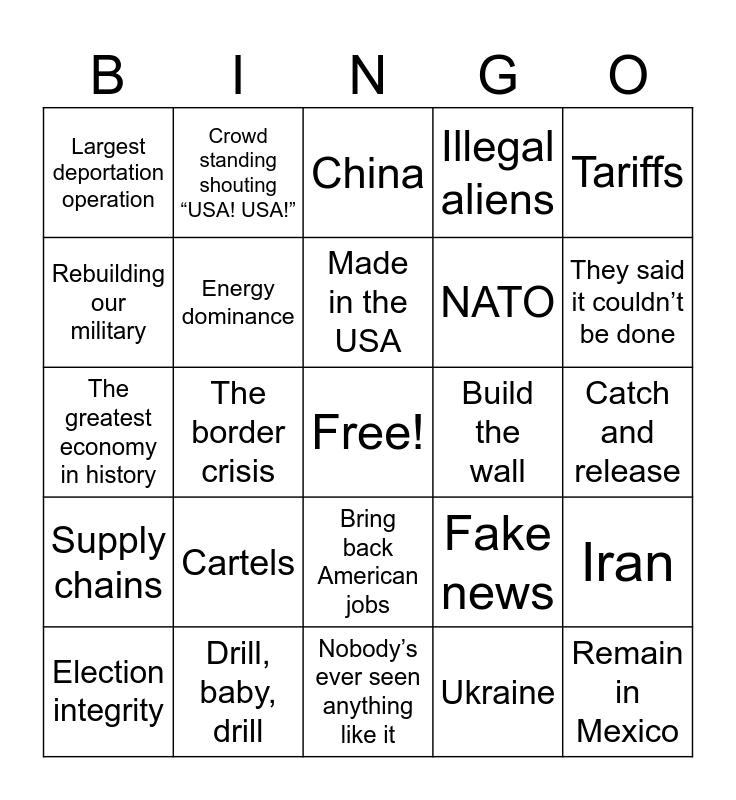 This bingo card has a free space and 40 words: America First, The greatest economy in history, Inflation disaster, Energy dominance, Drill, baby, drill, Bring back American jobs, Made in the USA, Unfair trade deals, Tariffs, Supply chains, The border crisis, Illegal aliens, Remain in Mexico, Catch and release, Build the wall, Cartels, Human trafficking, Largest deportation operation, Peace through strength, China, Iran, Ukraine, NATO, Rebuilding our military, Law and order, Radical left, Weaponization of government, Woke, Critical race theory, Protecting our children, Second Amendment, Election integrity, Witch hunt, Fake news, They said it couldn’t be done, Nobody’s ever seen anything like it, We’re just getting started, Common sense, Crowd standing shouting “USA! USA!” and Recognizing a special guest in the gallery.