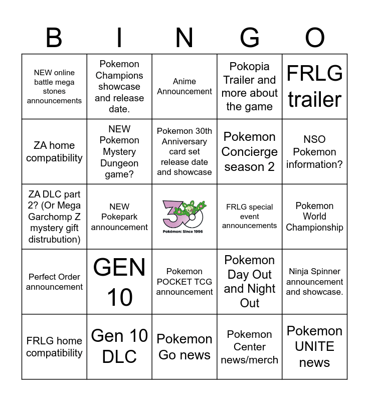 This bingo card has a free space and 24 words: GEN 10, Gen 10 DLC, Pokemon 30th Anniversary card set release date and showcase, FRLG home compatibility, FRLG trailer, NEW online battle mega stones announcements, ZA home compatibility, Pokemon Champions showcase and release date., FRLG special event announcements, Pokemon POCKET TCG announcement, Pokemon Concierge season 2, ZA DLC part 2? (Or Mega Garchomp Z mystery gift distrubution), Pokemon Day Out and Night Out, Ninja Spinner announcement and showcase., NEW Pokemon Mystery Dungeon game?, Pokemon Center news/merch, Pokemon World Championship, Anime Announcement, NSO Pokemon information?, NEW Pokepark announcement, Pokemon UNITE news, Perfect Order announcement, Pokopia Trailer and more about the game and Pokemon Go news.