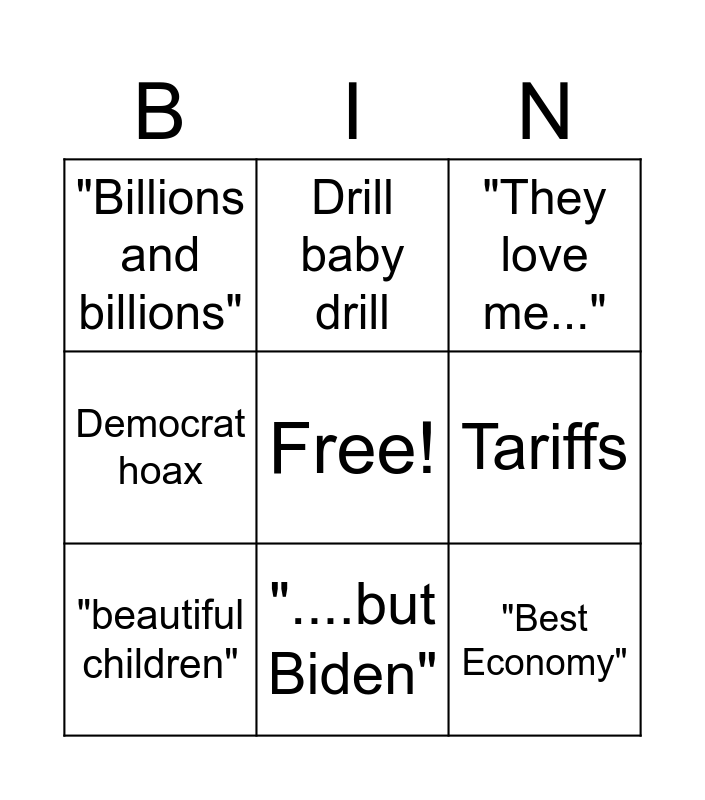 This bingo card has a free space and 11 words: "Hottest country on earth", "....but Biden", "Best Economy", "beautiful children", Drill baby drill, "They love me...", Tariffs, Supreme court, Democrat hoax, "Billions and billions" and Decreased drug pricing by 1000%+.