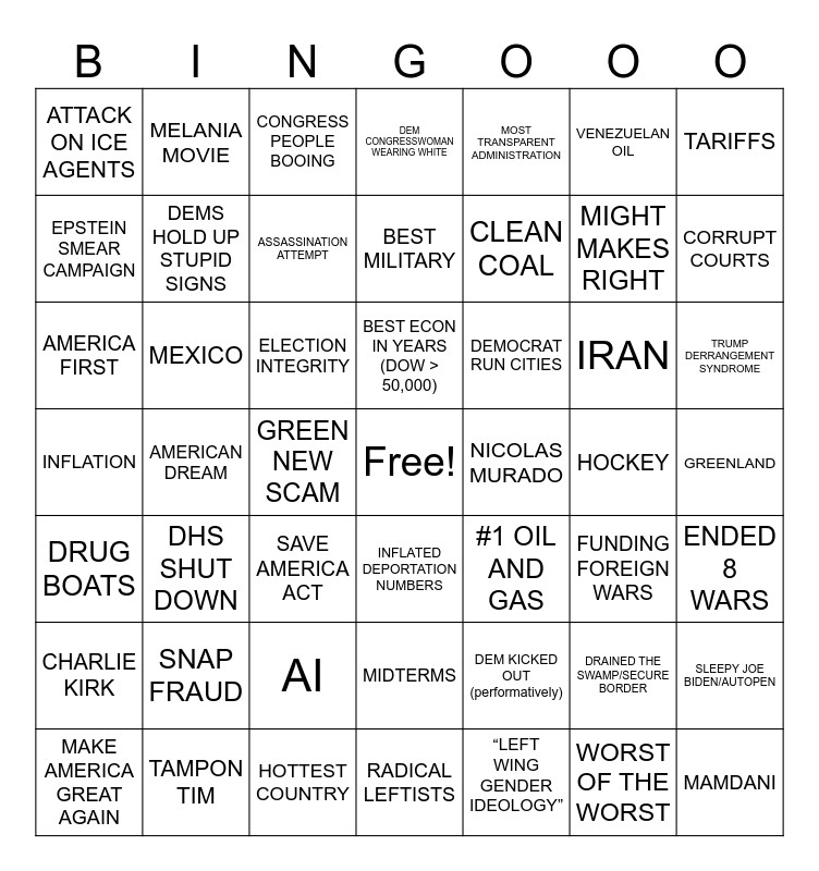 This bingo card has a free space and 48 words: DEM KICKED OUT (performatively), MIGHT MAKES RIGHT, RADICAL LEFTISTS, AMERICAN DREAM, ELECTION INTEGRITY, GREENLAND, MELANIA MOVIE, TAMPON TIM, VENEZUELAN OIL, INFLATED DEPORTATION NUMBERS, TARIFFS, DEM CONGRESSWOMAN WEARING WHITE, IRAN, DEMOCRAT RUN CITIES, CHARLIE KIRK, HOCKEY, EPSTEIN SMEAR CAMPAIGN, CORRUPT COURTS, DRAINED THE SWAMP/SECURE BORDER, MOST TRANSPARENT ADMINISTRATION, CLEAN COAL, GREEN NEW SCAM, ATTACK ON ICE AGENTS, DEMS HOLD UP STUPID SIGNS, SLEEPY JOE BIDEN/AUTOPEN, ASSASSINATION ATTEMPT, TRUMP DERRANGEMENT SYNDROME, MAKE AMERICA GREAT AGAIN, BEST ECON IN YEARS (DOW > 50,000), MEXICO, WORST OF THE WORST, NICOLAS MURADO, ENDED 8 WARS, SNAP FRAUD, INFLATION, #1 OIL AND GAS, FUNDING FOREIGN WARS, AMERICA FIRST, SAVE AMERICA ACT, AI, DRUG BOATS, MAMDANI, CONGRESS PEOPLE BOOING, HOTTEST COUNTRY, BEST MILITARY, MIDTERMS, DHS SHUT DOWN and “LEFT WING GENDER IDEOLOGY”.