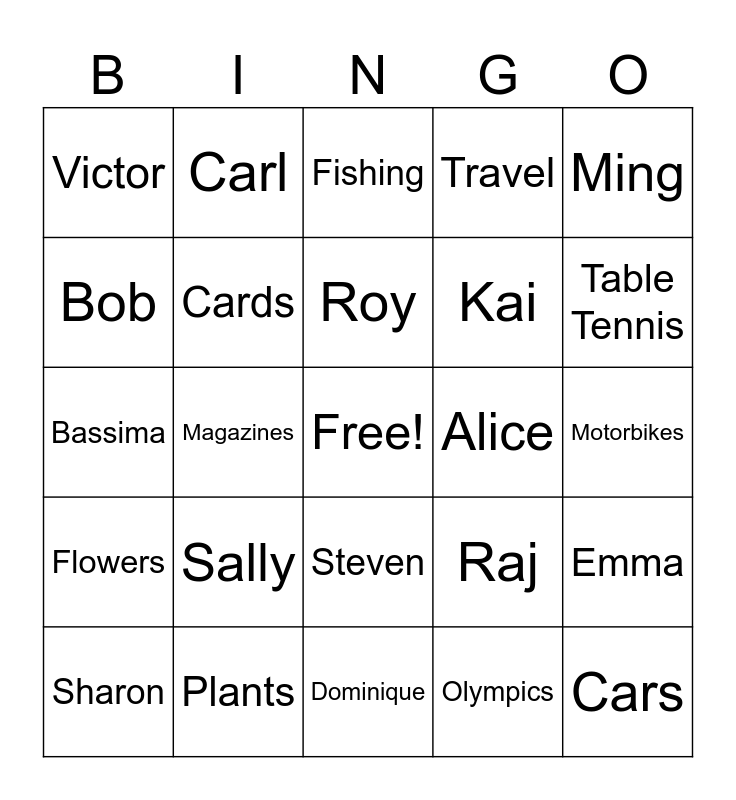 This bingo card has a free space and 25 words: Sally, Dominique, Roy, Sharon, Ming, Victor, Bob, Carl, Alice, Steven, Kai, Bassima, Raj, Emma, Cards, Quokkas, Motorbikes, Fishing, Table Tennis, Magazines, Cars, Plants, Flowers, Travel and Olympics.