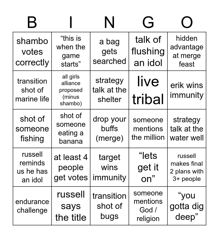 This bingo card has a free space and 24 words: at least 4 people get votes, russell says the title, strategy talk at the shelter, endurance challenge, hidden advantage at merge feast, shambo votes correctly, transition shot of marine life, “this is when the game starts”, someone mentions the million, target wins immunity, live tribal, shot of someone fishing, “lets get it on”, russell makes final 2 plans with 3+ people, all girls alliance proposed (minus shambo), someone mentions God / religion, strategy talk at the water well, a bag gets searched, erik wins immunity, shot of someone eating a banana, “you gotta dig deep”, russell reminds us he has an idol, talk of flushing an idol and transition shot of bugs.
