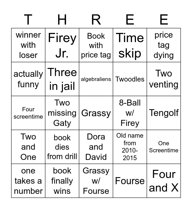 This bingo card has a free space and 24 words: book dies from drill, book finally wins, algebraliens, one takes a number, price tag dying, winner with loser, actually funny, Firey Jr., 8-Ball w/ Firey, Dora and David, Twoodles, Four screentime, Old name from 2010-2015, One Screentime, Three in jail, Fourse, Tengolf, Book with price tag, Two venting, Two missing Gaty, Four and X, Two and One, Time skip and Grassy w/ Fourse.