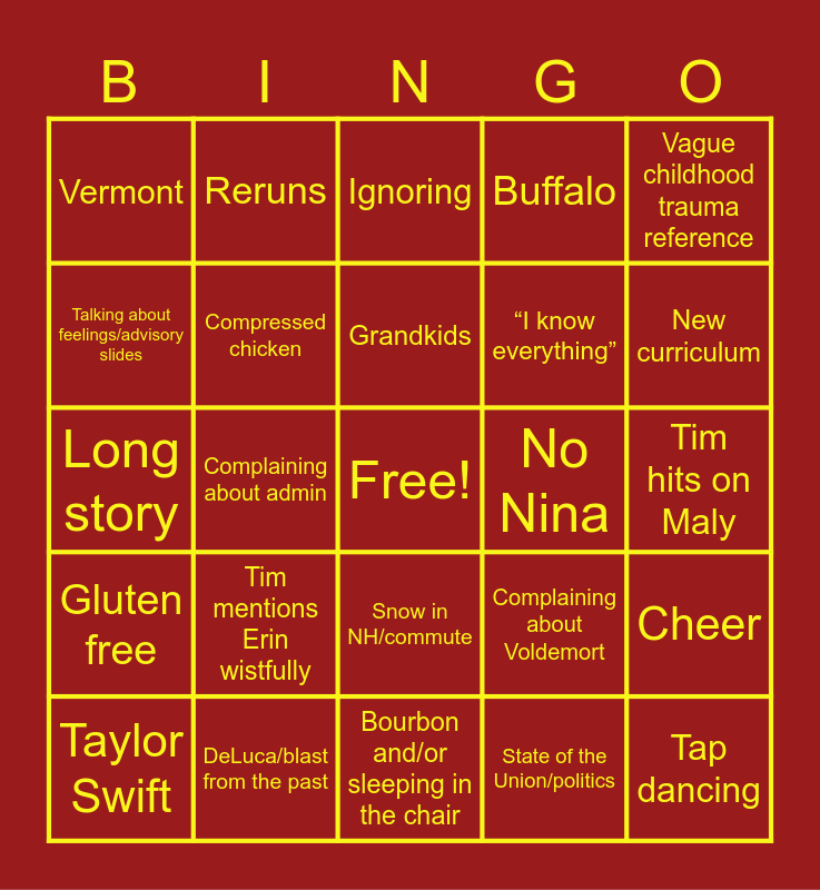 This bingo card has a free space and 24 words: Tim mentions Erin wistfully, DeLuca/blast from the past, Grandkids, Taylor Swift, Vague childhood trauma reference, Vermont, Talking about feelings/advisory slides, Reruns, No Nina, Snow in NH/commute, “I know everything”, Long story, Complaining about Voldemort, Cheer, Compressed chicken, State of the Union/politics, Tim hits on Maly, Ignoring, New curriculum, Complaining about admin, Tap dancing, Gluten free, Buffalo and Bourbon and/or sleeping in the chair.