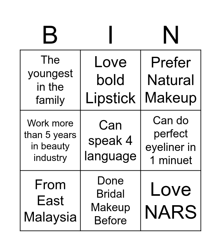 This bingo card has a free space and 8 words: Work more than 5 years in beauty industry, Love bold Lipstick, Can do perfect eyeliner in 1 minuet, From East Malaysia, Prefer Natural Makeup, The youngest in the family, Done Bridal Makeup Before and Love NARS.