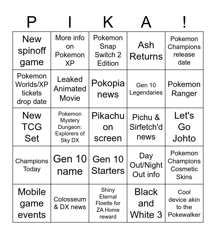 This bingo card has a free space and 24 words: Gen 10 name, Colosseum & DX news, Pokopia news, Mobile game events, Pokemon Champions release date, New spinoff game, Pokemon Worlds/XP tickets drop date, More info on Pokemon XP, Pichu & Sirfetch'd news, Gen 10 Starters, Gen 10 Legendaries, New TCG Set, Day Out/Night Out info, Pokemon Champions Cosmetic Skins, Leaked Animated Movie, Black and White 3, Let's Go Johto, Pokemon Snap Switch 2 Edition, Pokemon Ranger, Pokemon Mystery Dungeon: Explorers of Sky DX, Cool device akin to the Pokewalker, Champions Today, Ash Returns and Shiny Eternal Floette for ZA Home reward.
