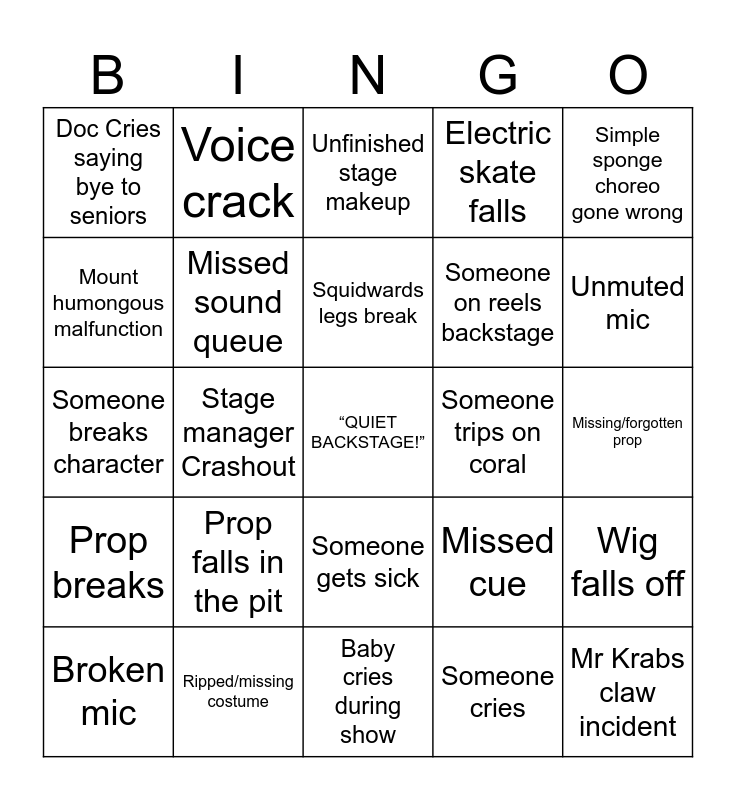 This bingo card has a free space and 24 words: Prop falls in the pit, Ripped/missing costume, Squidwards legs break, Broken mic, Simple sponge choreo gone wrong, Doc Cries saying bye to seniors, Mount humongous malfunction, Voice crack, Someone trips on coral, Someone gets sick, Someone on reels backstage, Someone breaks character, Missed cue, Wig falls off, Missed sound queue, Someone cries, Missing/forgotten prop, Unfinished stage makeup, Unmuted mic, Stage manager Crashout, Mr Krabs claw incident, Prop breaks, Electric skate falls and Baby cries during show.