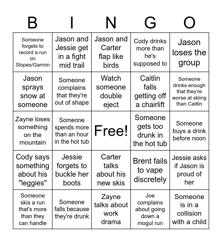 This bingo card has a free space and 27 words: Brent fails to vape discretely, Joe is visibly displeased with Carter, Caitlin falls getting off a chairlift, Zayne talks about work drama, Jason sprays snow at someone, Jason and Carter flap like birds, Jason and Jessie get in a fight mid trail, Cody says something about his "leggies", Someone gets too drunk in the hot tub, Jessie asks if Jason is proud of her, Zayne loses something on the mountain, Cody drinks more than he's supposed to, Someone skis a run that's more than they can handle, Someone falls because they're drunk, Someone drinks enough that they're worse at skiing than Caitlin, Zayne talks about Trizepitide, Someone complains that they're out of shape, Watch someone double eject, Jessie forgets to buckle her boots, Someone forgets to record a run on Slopes/Garmin, Someone buys a drink before noon, Joe complains about going down a mogul run, Someone spends more than an hour in the hot tub, Someone is in a collision with a child, Carter talks about his new skis, Jason loses the group and Someone gets lost.