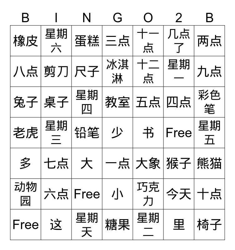 This bingo card has 49 words: 今天, 星期一, 星期二, 星期三, 星期四, 星期五, 星期六, 星期天, 几点了, 一点, 两点, 三点, 四点, 五点, 六点, Free, 八点, 九点, 十点, 十一点, 十二点, 铅笔, 橡皮, 剪刀, Free, 尺子, 彩色笔, 这, 教室, 桌子, 椅子, 书, 动物园, Free, 老虎, 大象, 猴子, 熊猫, 兔子, 大, 小, 多, 少, 糖果, 冰淇淋, 蛋糕, 巧克力, 七点 and 里.