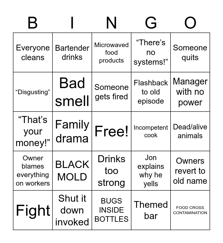 This bingo card has a free space and 24 words: BLACK MOLD, Shut it down invoked, Someone gets fired, Fight, Someone quits, Everyone cleans, “Disgusting”, Bartender drinks, Incompetent cook, Drinks too strong, Flashback to old episode, “That’s your money!”, Jon explains why he yells, Owners revert to old name, Bad smell, Themed bar, Dead/alive animals, Microwaved food products, Manager with no power, Family drama, FOOD CROSS CONTAMINATION, Owner blames everything on workers, “There’s no systems!” and BUGS INSIDE BOTTLES.