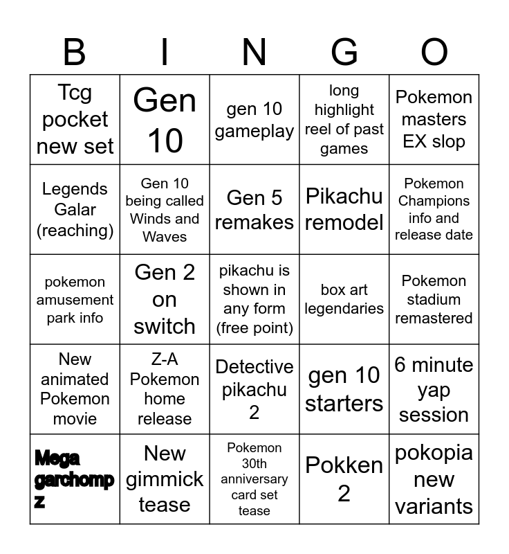 This bingo card has a free space and 24 words: Z-A Pokemon home release, New gimmick tease, Gen 5 remakes, Mega garchomp z, Pokemon masters EX slop, Tcg pocket new set, Legends Galar (reaching), Gen 10, box art legendaries, Detective pikachu 2, Pikachu remodel, pokemon amusement park info, gen 10 starters, 6 minute yap session, Gen 10 being called Winds and Waves, Pokken 2, Pokemon stadium remastered, gen 10 gameplay, Pokemon Champions info and release date, Gen 2 on switch, pokopia new variants, New animated Pokemon movie, long highlight reel of past games and Pokemon 30th anniversary card set tease.