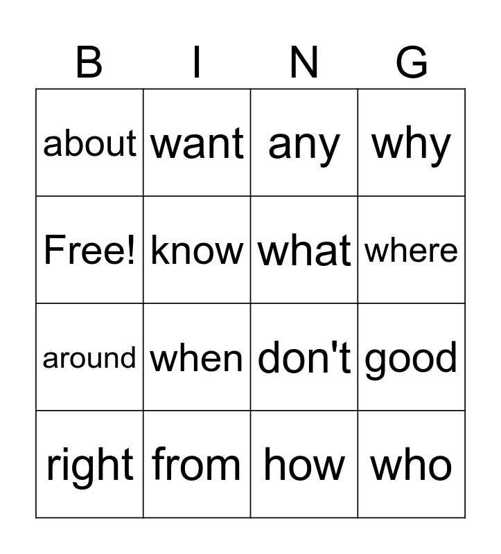 This bingo card has 16 words: from, good, any, about, around, want, don't, how, Free!, know, right, why, when, where, what and who.