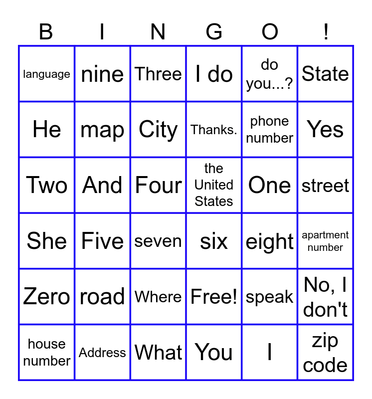 This bingo card has 36 words: Free!, Where, You, He, She, the United States, map, What, do you...?, speak, Yes, I do, No, I don't, And, Thanks., language, Zero, One, Two, Three, Four, Five, six, seven, eight, nine, phone number, Address, City, State, zip code, house number, apartment number, street, road and I.