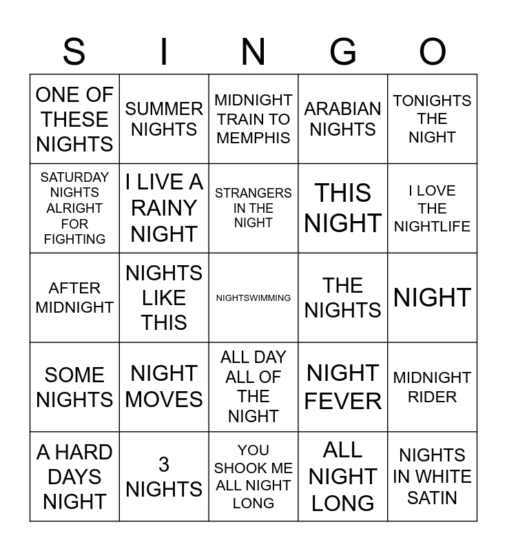 This bingo card has 25 words: NIGHT MOVES, YOU SHOOK ME ALL NIGHT LONG, STRANGERS IN THE NIGHT, A HARD DAYS NIGHT, TONIGHTS THE NIGHT, ONE OF THESE NIGHTS, SATURDAY NIGHTS ALRIGHT FOR FIGHTING, SUMMER NIGHTS, THE NIGHTS, ALL DAY ALL OF THE NIGHT, THIS NIGHT, AFTER MIDNIGHT, NIGHT FEVER, MIDNIGHT RIDER, I LIVE A RAINY NIGHT, NIGHTS IN WHITE SATIN, NIGHT, MIDNIGHT TRAIN TO MEMPHIS, I LOVE THE NIGHTLIFE, NIGHTS LIKE THIS, NIGHTSWIMMING, 3 NIGHTS, SOME NIGHTS, ARABIAN NIGHTS and ALL NIGHT LONG.