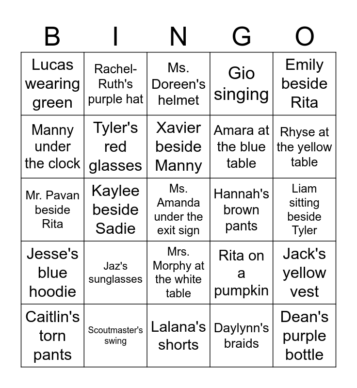 This bingo card has 43 words: Free!, Ms. Amanda under the exit sign, Ms. Ashley's skates, Caitlin's torn pants, Mr. Craig's crown, Daylynn's braids, Ms. Doreen's helmet, Mr. Drew holding sticks, Emily beside Rita, Scoutmaster's swing, Gio singing, Hannah's brown pants, Mrs. Morphy at the white table, Jaz's sunglasses, Ms. Kara with Santa, Lalana's shorts, Mr. Michael's guitar, Mr. Pavan beside Rita, Raedyn's glasses, Rhyse at the yellow table, Rachel-Ruth's purple hat, Ben K beside Clara, Judah beside Tyler, Lucas wearing green, Luke K's gray pants, Liam sitting beside Tyler, Reid's green crown, Corbin's molars, Rita on a pumpkin, Jesse's blue hoodie, Clara's Stitch shirt, Jack's yellow vest, Benjamin's red shirt, Kaylee beside Sadie, Sadie's cards, Grayson's yellow bow, Dean's purple bottle, Xavier beside Manny, Manny under the clock, Amara at the blue table, Warner's Sonic shirt, Tyler's red glasses and Charles's black pants.
