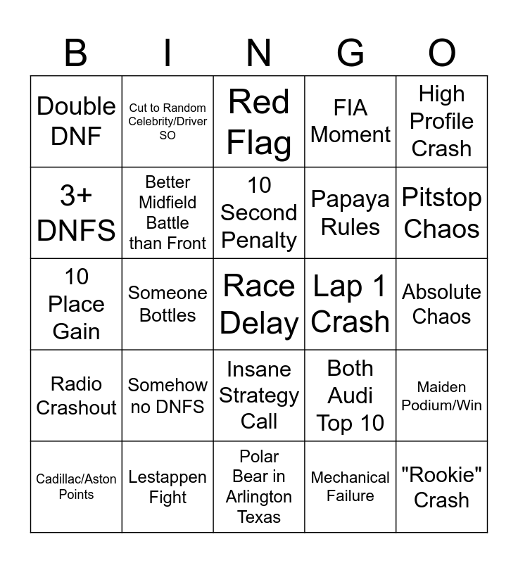 This bingo card has 28 words: Maiden Podium/Win, Ferrari Strategy, Papaya Rules, Mechanical Failure, 3+ DNFS, Red Flag, Cut to Random Celebrity/Driver SO, Radio Crashout, Lap 1 Crash, Cadillac/Aston Points, 10 Place Gain, FIA Moment, Lestappen Fight, Polar Bear in Arlington Texas, Pitstop Chaos, Al Merqaedes, Somehow no DNFS, Better Midfield Battle than Front, 10 Second Penalty, Insane Strategy Call, Double DNF, "Rookie" Crash, Race Delay, Someone Bottles, Absolute Chaos, Both Audi Top 10, High Profile Crash and Teammate Battle.