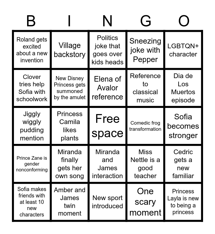 This bingo card has a free space and 24 words: Miranda finally gets her own song, Amber and James twin moment, Elena of Avalor reference, Sofia makes friends with at least 10 new characters, LGBTQN+ character, Roland gets excited about a new invention, Clover tries help Sofia with schoolwork, Village backstory, Comedic frog transformation, Miranda and James interaction, Reference to classical music, Jiggly wiggly pudding mention, Miss Nettle is a good teacher, Cedric gets a new familiar, New Disney Princess gets summoned by the amulet, One scary moment, Sofia becomes stronger, Politics joke that goes over kids heads, Dia de Los Muertos episode, Princess Camila likes plants, Princess Layla is new to being a princess, Prince Zane is gender nonconforming, Sneezing joke with Pepper and New sport introduced.