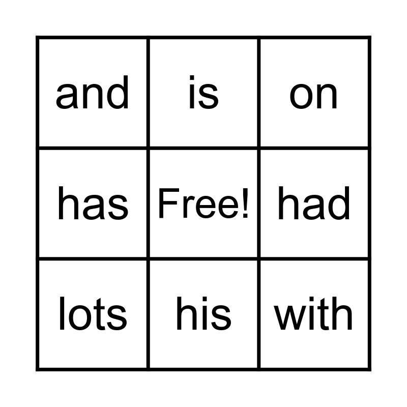 This bingo card has a free space and 16 words: a, the, on, and, no, is, me, she, with, had, as, has, of, his, lots and into.