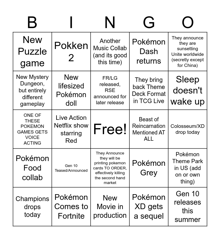 This bingo card has a free space and 25 words: Gen 10 Teased/Announced, New Movie in production, FR/LG released, RSE announced for later release, Champions drops today, They announce they are sunsetting Unite worldwide (secretly except for China), New Puzzle game, New Mystery Dungeon, but entirely different gameplay, Pokken 2, Beast of Reincarnation Mentioned AT ALL, They Announce they will be printing pokemon cards TO ORDER, effectively killing the second hand market, They bring back Theme Deck Format in TCG Live, ONE OF THESE POKEMON GAMES GETS VOICE ACTING, Pokémon Grey, Pokémon Theme Park in US (add on or own thing), New lifesized Pokémon doll, Another Pokémon Center in the US, Colosseum/XD drop today, Another Music Collab (and its good this time), Sleep doesn't wake up, Live Action Netflix show starring Red, Gen 10 releases this summer, Pokémon Comes to Fortnite, Pokémon Food collab, Pokémon Dash returns and Pokémon XD gets a sequel.