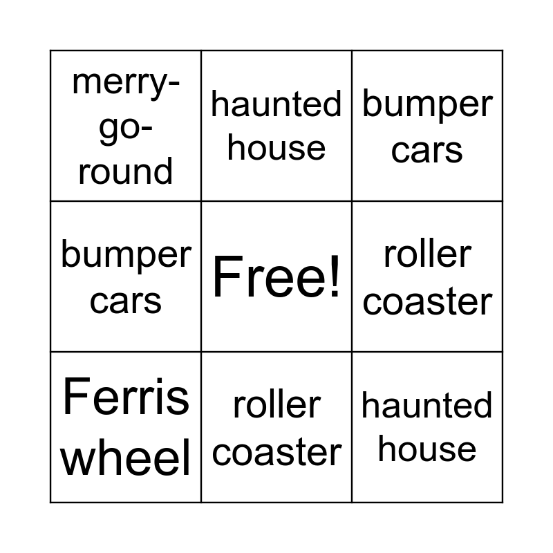 This bingo card has a free space and 8 words: roller coaster, bumper cars, haunted house, Ferris wheel, merry-go-round, haunted house, bumper cars and roller coaster.