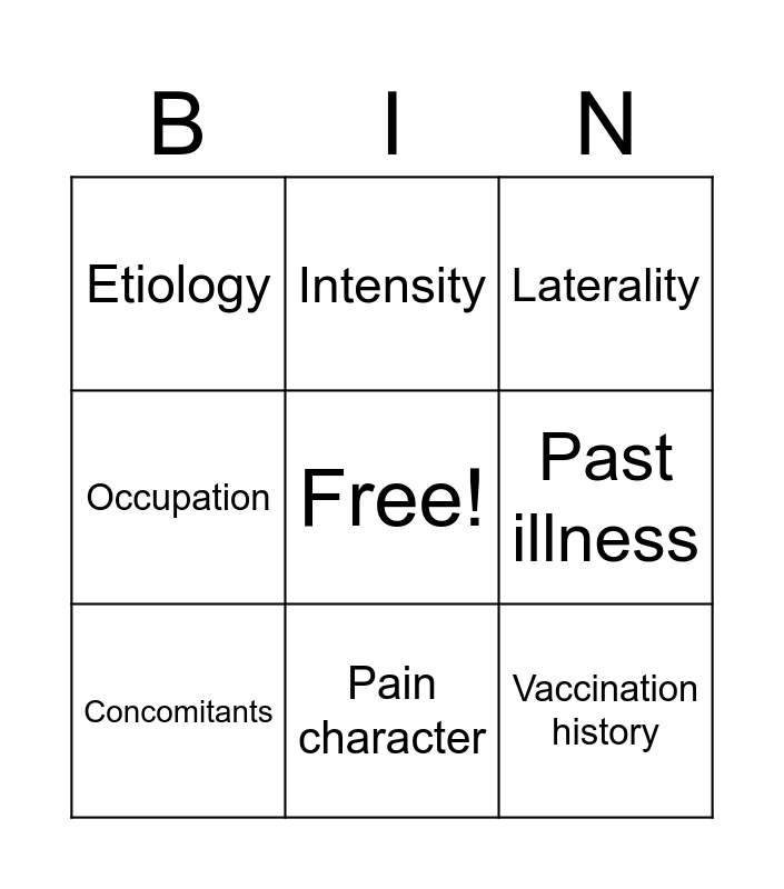 This bingo card has a free space and 21 words: Onset, Duration, Intensity, Radiation, Sensation, Concomitants, Etiology, Laterality, Discharge characteristics, Pain character, Patient Background, Occupation, Lifestyle, Family history, Past illness, Trauma history, Stress factors, Addictions, Vaccination history, Socioeconomic status and Relationship dynamics.