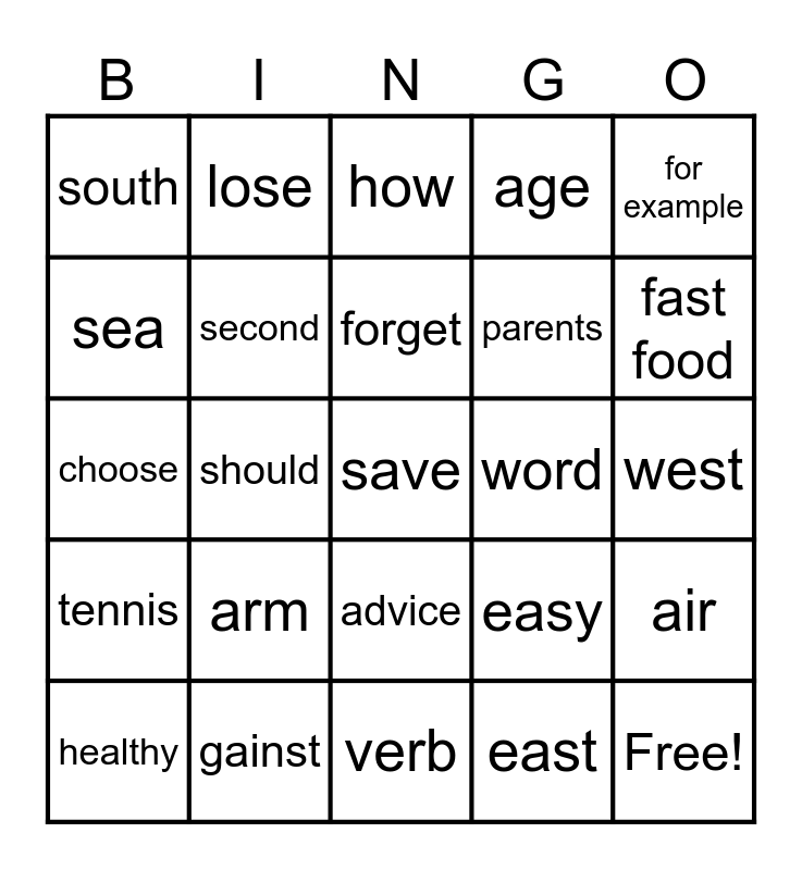 This bingo card has 33 words: Free!, special, should, winner, tennis, second, for example, healthy, lose, move, forget, how, other, together, word, fast food, gainst, choose, arm, easy, advice, after, south, west, verb, save, age, parents, sea, air, north, east and adult.