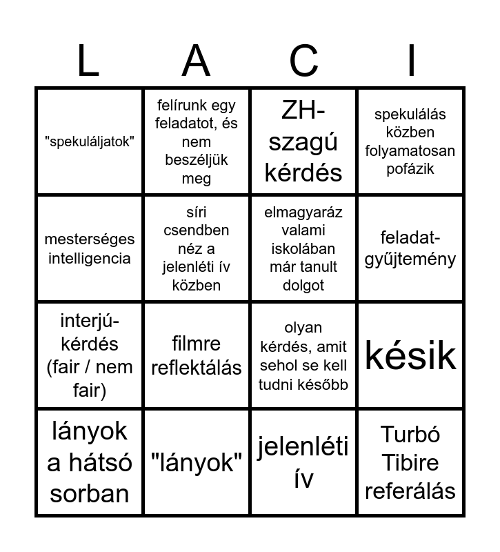This bingo card has 16 words: "lányok", késik, ZH-szagú kérdés, "spekuláljatok", interjú-kérdés (fair / nem fair), felírunk egy feladatot, és nem beszéljük meg, olyan kérdés, amit sehol se kell tudni később, jelenléti ív, mesterséges intelligencia, síri csendben néz a jelenléti ív közben, lányok a hátsó sorban, spekulálás közben folyamatosan pofázik, filmre reflektálás, feladat-gyűjtemény, elmagyaráz valami iskolában már tanult dolgot and Turbó Tibire referálás.