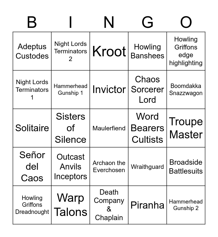 This bingo card has 25 words: Outcast Anvils Inceptors, Death Company & Chaplain, Invictor, Howling Griffons Dreadnought, Howling Griffons edge highlighting, Adeptus Custodes, Night Lords Terminators 1, Night Lords Terminators 2, Word Bearers Cultists, Archaon the Everchosen, Chaos Sorcerer Lord, Solitaire, Wraithguard, Broadside Battlesuits, Hammerhead Gunship 1, Hammerhead Gunship 2, Troupe Master, Kroot, Boomdakka Snazzwagon, Sisters of Silence, Maulerfiend, Warp Talons, Señor del Caos, Howling Banshees and Piranha.