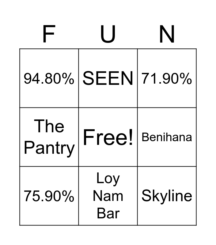 This bingo card has a free space and 8 words: Benihana, 71.90%, SEEN, 75.90%, 94.80%, Skyline, The Pantry and Loy Nam Bar.